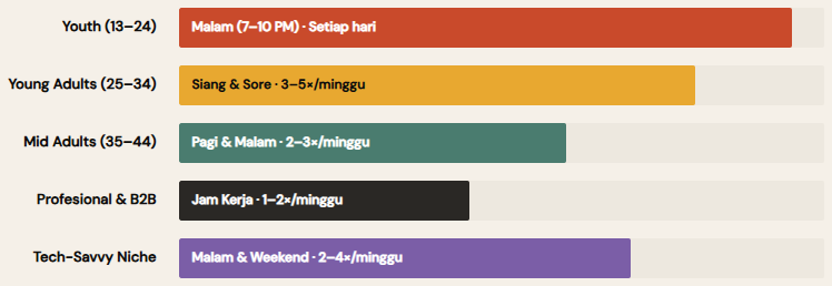 Posting di waktu yang salah adalah membuang konten bagus ke tempat yang sepi. Setiap segmen punya ritme hidupnya sendiri — dan strategi kontenmu harus mengikuti ritme mereka, bukan ritmemu.